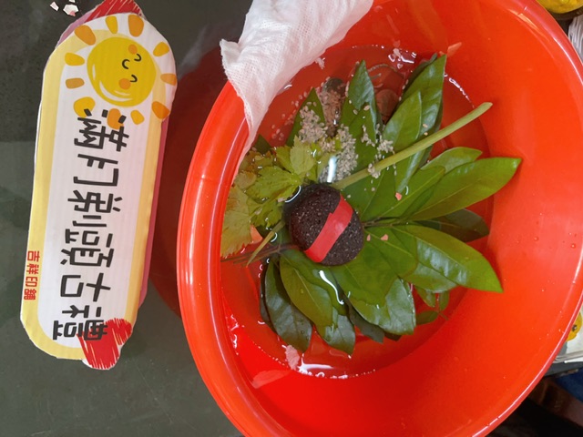 - 煮熟鴨蛋1個 「 含意:嬰兒的身形跟鴨蛋的形狀一樣、身材健美」