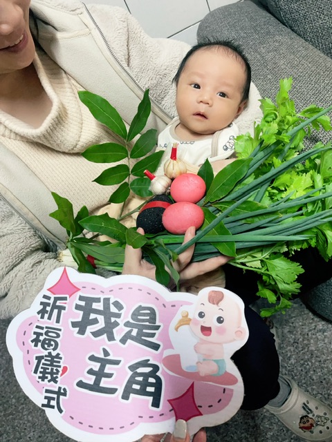 - 煮熟鴨蛋1個 「 含意:嬰兒的身形跟鴨蛋的形狀一樣、身材健美」